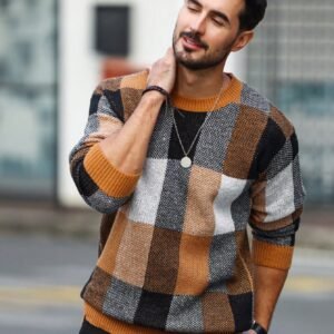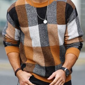Men’s Plaid Knit Sweater – Classic Round Neck Casual Style