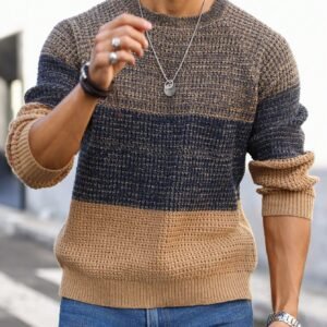 Men’s Color Block Sweater – Casual Round Neck Long Sleeve Style