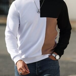 Men’s Patchwork Sweatshirt – Solid Color Crew Neck Long Sleeve Style